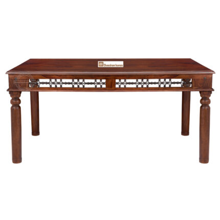 Discover a 6-seater dining table that seamlessly blends tradition and luxury. Crafted from premium sheesham wood, its solid round legs are not only dismantlable but also add a touch of stability. The traditional wooden frame is accentuated with intricate metal iron grill designs, creating a dining experience that transcends time. Elevate your gatherings with the timeless charm.