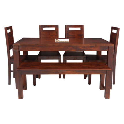 This compact  dining set 6 seater is one of the stylish pieces of dining tables. The addition of a bench in this dining set is there to make your experience more comfortable. This dining table set completes the ambience of your dining area, making it more enjoyable. The legs of the dining table are sturdy in nature and can withstand the weight put on it. Chairs with beautiful design comforts you with a healthy and relaxing posture. Therefore, it is a welcoming furniture for everyday use. This range of furniture will not only accentuate the interior of your home, but also will give you a spot at home to sit and have your meal.
