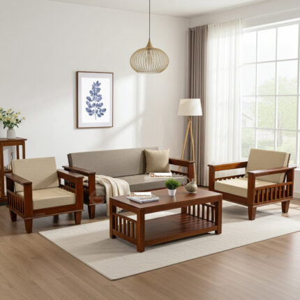 This wooden Sofa Set Crafted from high-quality Sheesham wood, Each piece in this exquisite sofa set is a masterpiece, showcasing the natural beauty and durability of Sheesham wood. The sturdy frame not only ensures longevity but also provides a solid foundation, The natural grain of this wooden Sofa adds a touch of organic beauty, making each piece unique. Whether you’re furnishing a contemporary living space or enhancing a classic interior, Effortlessly elevates your home décor. The rich, warm tones of Sheesham wood infuse a sense of warmth and character into your living space, creating a welcoming ambiance for both family and guests. Invest in the artistry of fine furniture with this wooden sofa – where comfort, durability, and style converge to create a focal point of elegance in your living space. Redefine your home with this stunning addition that stands the test of time.