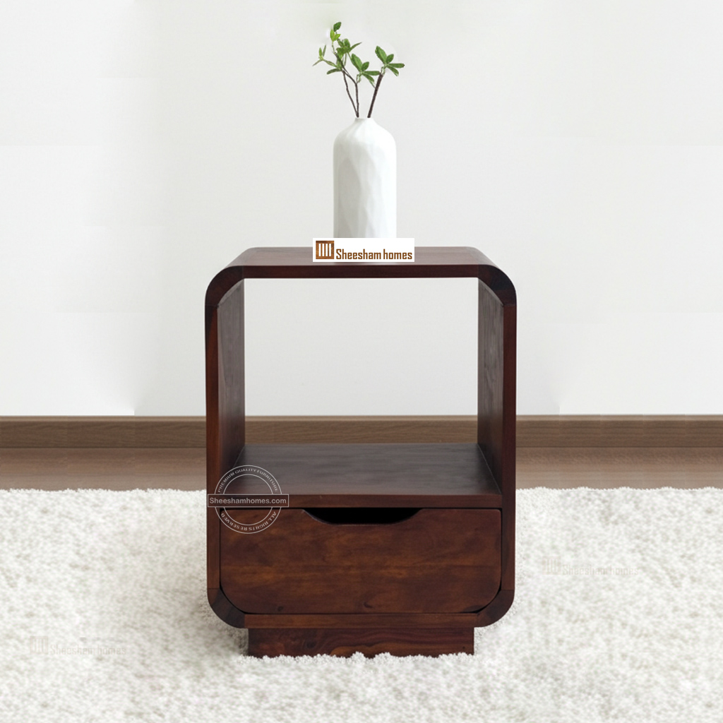 A round corner bed side table is a functional and stylish piece of furniture made from the durable and attractive Sheesham wood. It features a rounded corner design for a softer and more visually appealing look. The table typically has a top surface for placing lamps, books, or other items, and an open shelf just below the top, providing additional storage space. The bottom of the table is a single drawer for storing smaller items such as reading glasses, phone, or personal items. The open shelves and single drawer offer ample storage space while the round corners give the table a soft and elegant appearance, making it a perfect addition to any bedroom.
