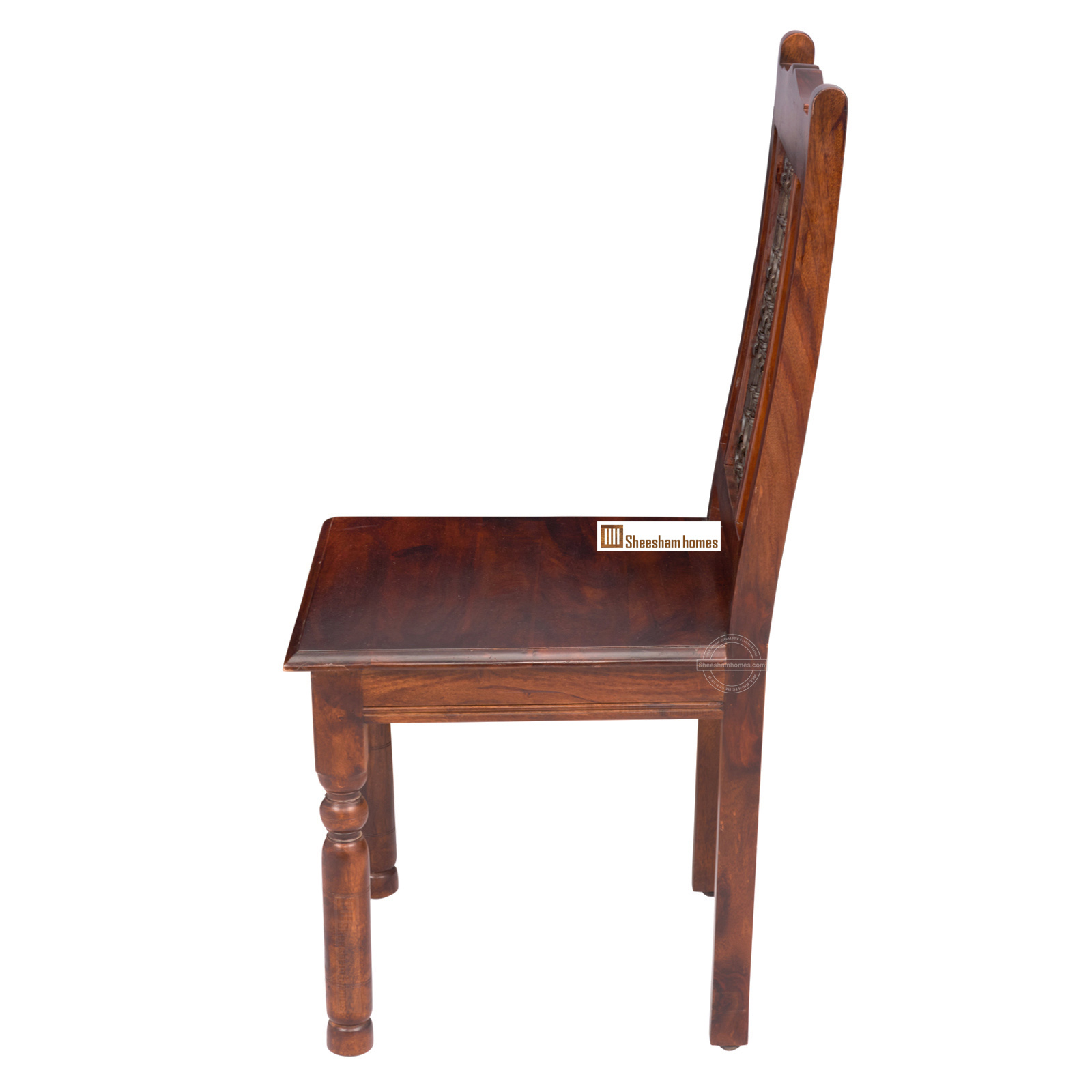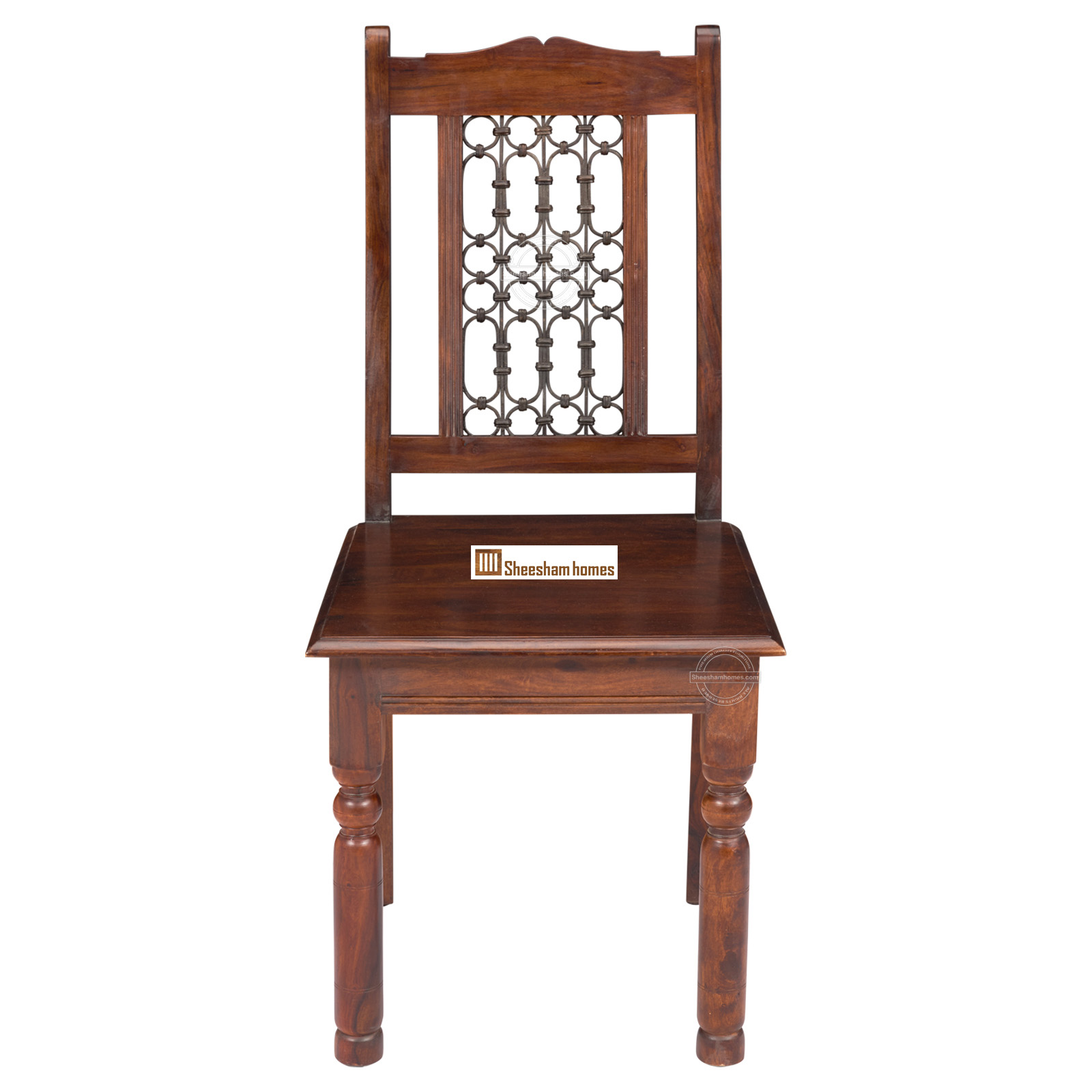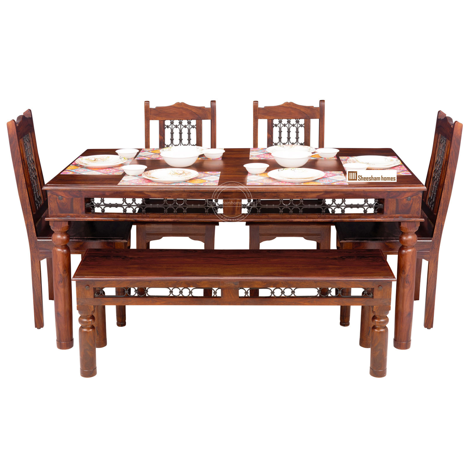 Vintage inspired beauty with high burnished walnut finish, This Handmade artisanal craftmanship from across India brought to you by SHEESHAM HOMES. Ethnic furniture takes you back to a different era of time. Your house becomes a home with furniture that transcends generations. The table showcases an antique pewter effect wooden frame along with carefully crafted sturdy chairs. Rajasthani jali design dining table has been magnificently hand carved and has been given a feel of vintage design. It balances design with the practicality that your home demands. This is perfect for family dining, dinner gathering with friends and comfortable enough to keep your guests lingering with lively conversation.