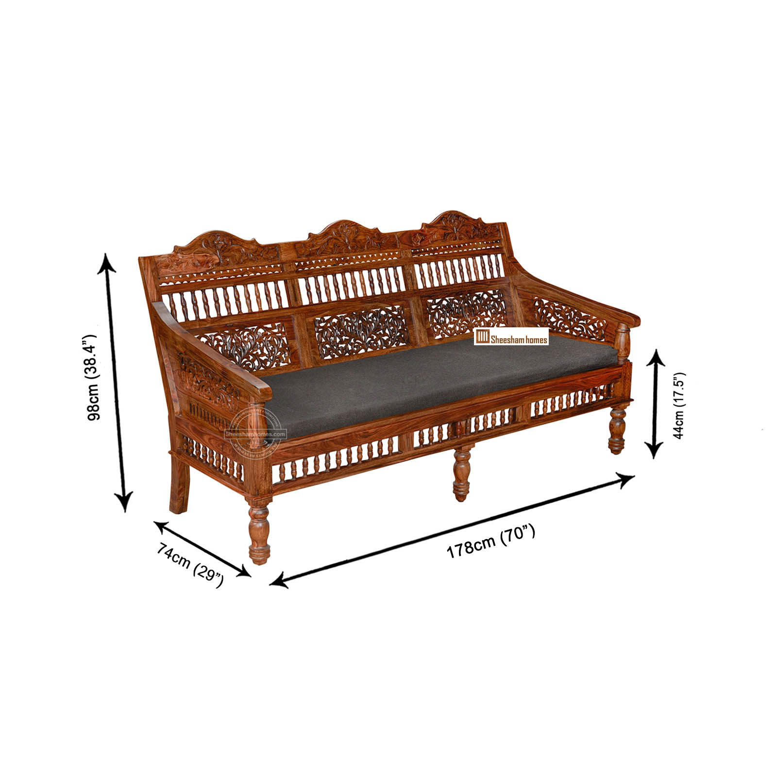 This wooden Sofa Two seater Crafted from high-quality Sheesham wood, Each piece in this exquisite sofa is a masterpiece, showcasing the natural beauty and durability of Sheesham wood. The sturdy frame not only ensures longevity but also provides a solid foundation, The natural grain of this wooden Sofa adds a touch of organic beauty, making each piece unique.