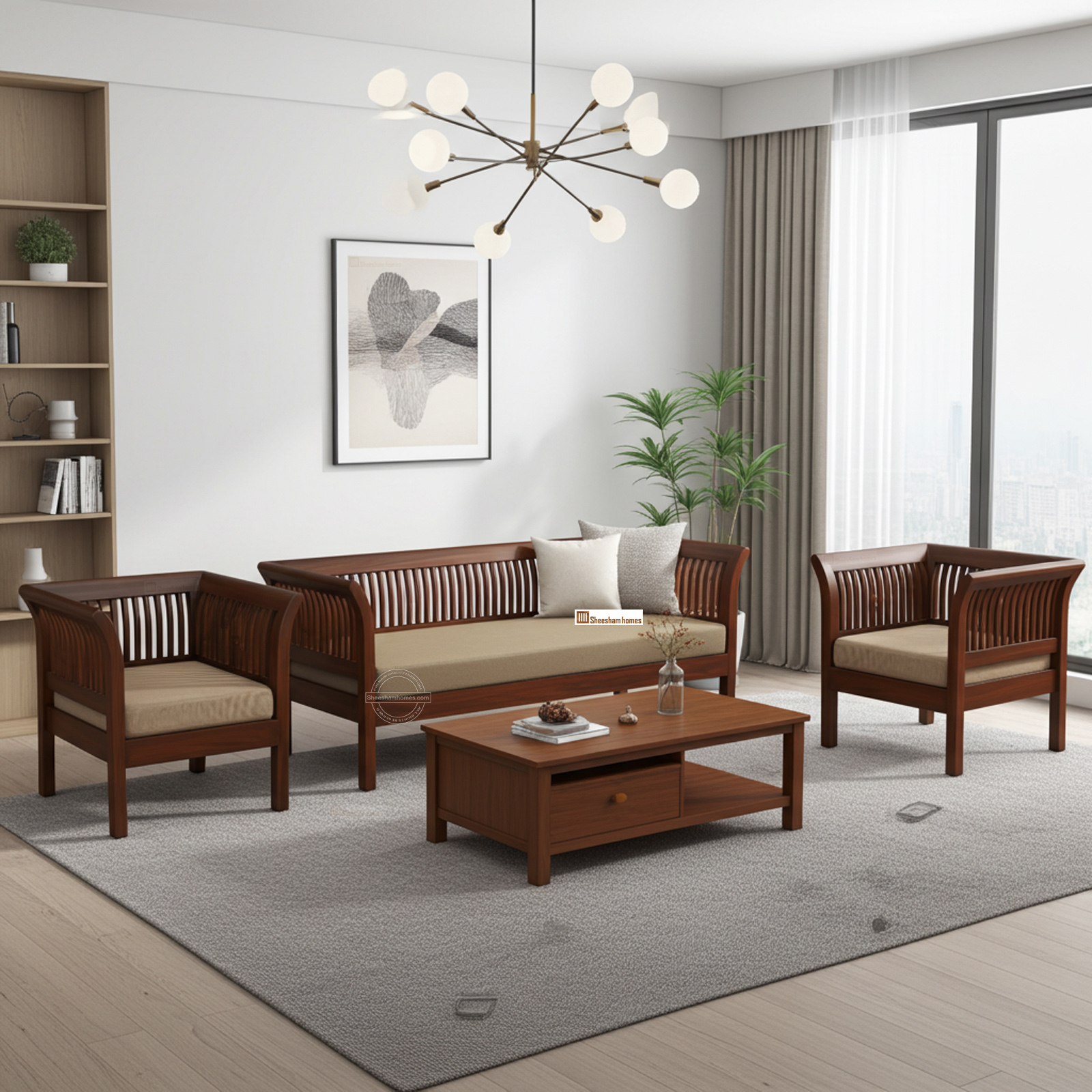 This wooden sofa Three seater Crafted from high-quality Sheesham wood, Each piece in this exquisite sofa is a masterpiece, showcasing the natural beauty and durability of Sheesham wood. The sturdy frame not only ensures longevity but also provides a solid foundation, The natural grain of this wooden Sofa adds a touch of organic beauty, making each piece unique.