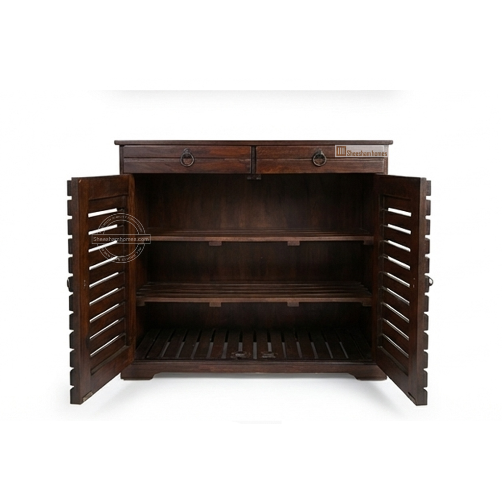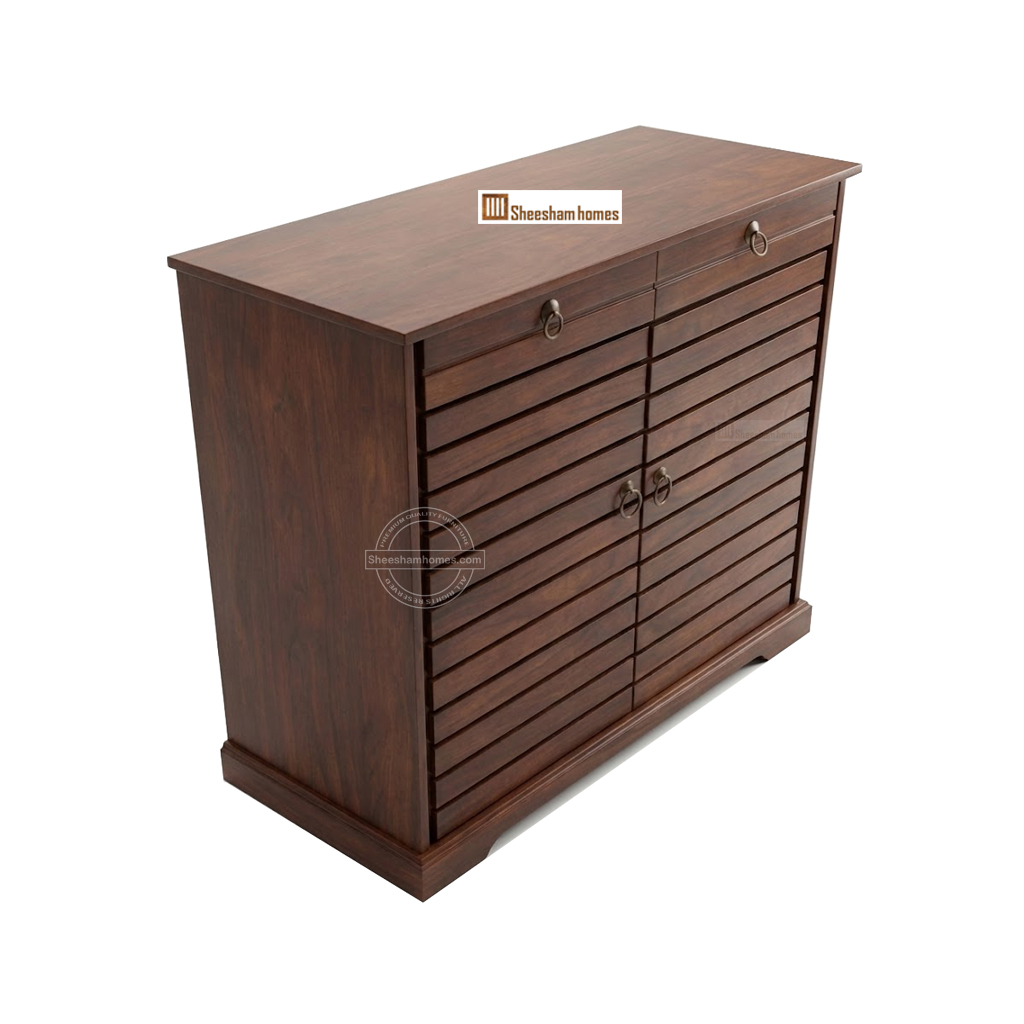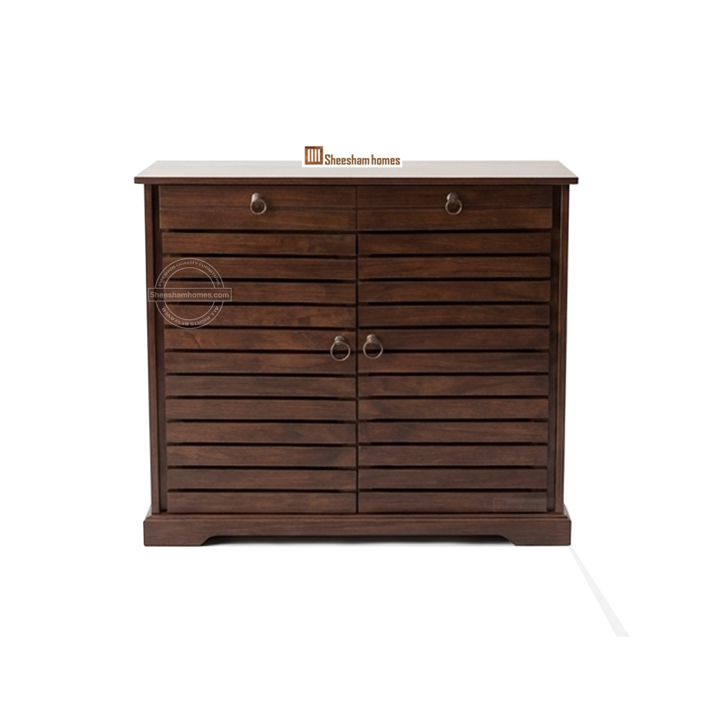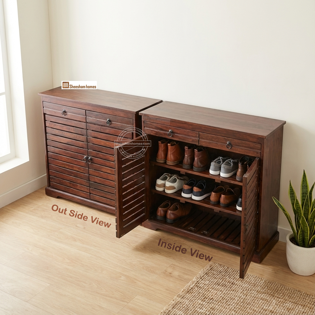 This compact shoe rack crafted from solid Sheesham wood offers the perfect balance of style, strength, and smart storage. Designed with walnut finish, it blends seamlessly with modern and traditional interiors. The rack provides organized storage for multiple pairs of shoes with well-spaced internal shelves. It features two top drawers, ideal for storing socks, shoe polish, brushes, and other daily accessories. The front doors are designed with Gaps, allowing proper air circulation to keep shoes fresh and odor-free.Its space-efficient design makes it an excellent choice for apartments and smaller entryways, while still delivering durability and functionality.